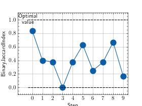 >>> # Example plotting multiple values >>> from torch import rand, randint >>> from torchmetrics.classification import BinaryJaccardIndex >>> metric = BinaryJaccardIndex() >>> values = [ ] >>> for _ in range(10): ... values.append(metric(rand(10), randint(2,(10,)))) >>> fig_, ax_ = metric.plot(values)