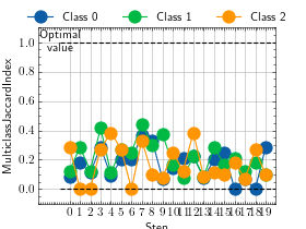 >>> # Example plotting a multiple values per class >>> from torch import randint >>> from torchmetrics.classification import MulticlassJaccardIndex >>> metric = MulticlassJaccardIndex(num_classes=3, average=None) >>> values = [] >>> for _ in range(20): ... values.append(metric(randint(3, (20,)), randint(3, (20,)))) >>> fig_, ax_ = metric.plot(values)