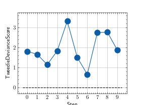 >>> from torch import randn >>> # Example plotting multiple values >>> from torchmetrics.regression import TweedieDevianceScore >>> metric = TweedieDevianceScore() >>> values = [] >>> for _ in range(10): ... values.append(metric(randn(10,), randn(10,))) >>> fig, ax = metric.plot(values)